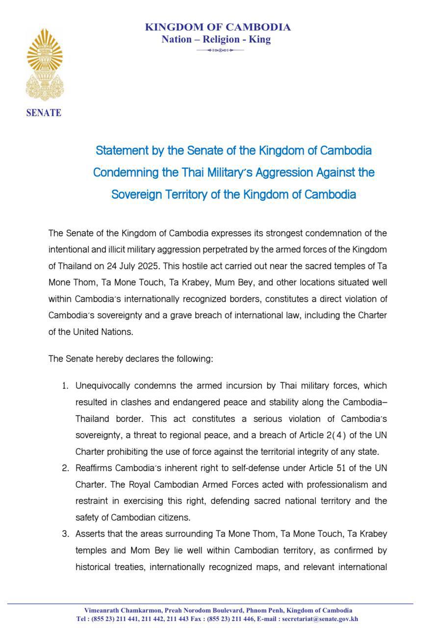 Statement by the Senate of the Kingdom of Cambodia Condemning the Thai Military's Aggression Against the Sovereign Territory of the Kingdom of Cambodia