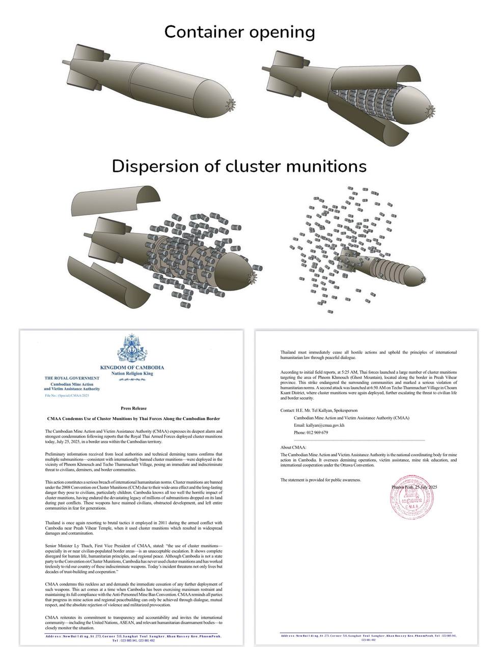 AKP Phnom Penh, July 25, 2025 -- The Cambodian Mine Action and Victim Assistance Authority (CMAA) this morning issued a press release condemning the use of cluster munitions by Thai forces along the Cambodian border. In the press release, CMAA expressed its deepes...