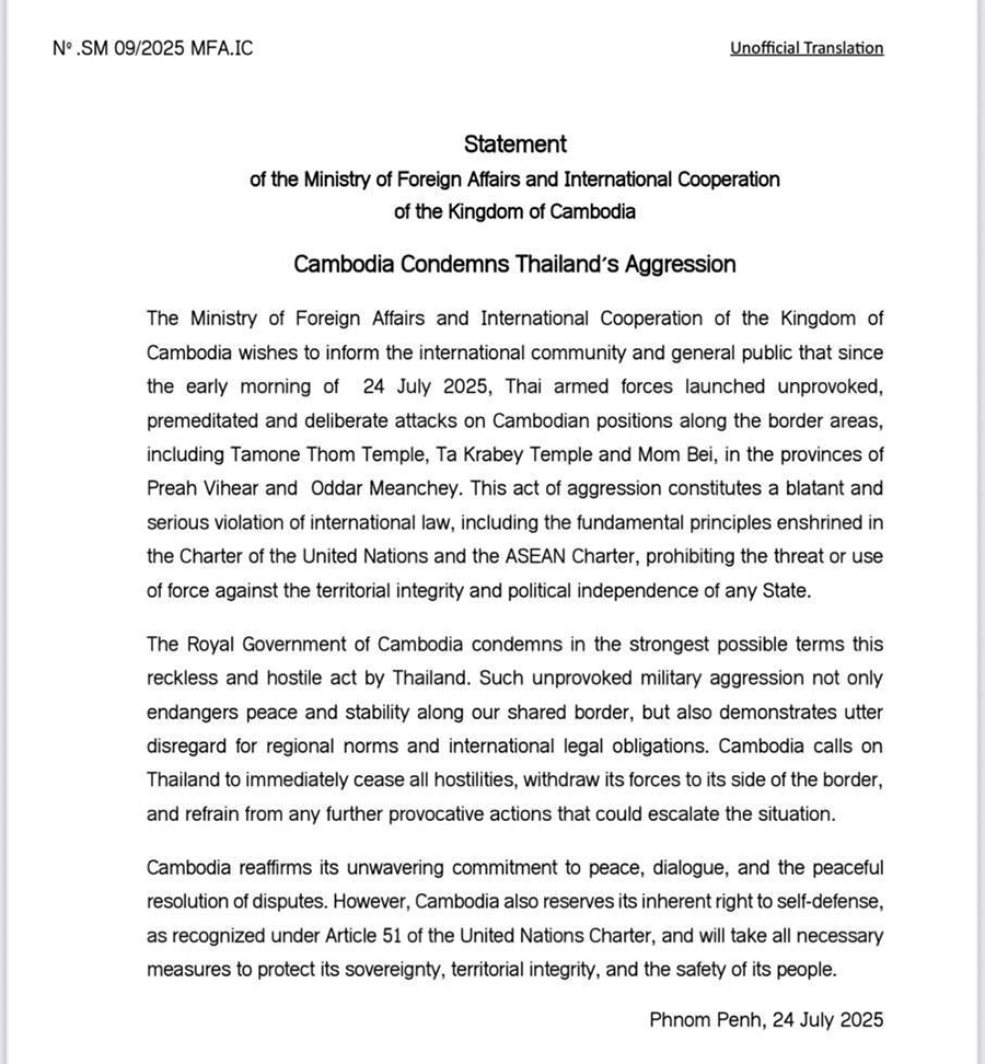 AKP Phnom Penh, July 24, 2025 -- The Ministry of Foreign Affairs and International Cooperation of the Kingdom of Cambodia issued on July 24 a statement firmly condemning Thailand's hostile act. The full statement reads as follows: "The Ministry of Foreign Affai...