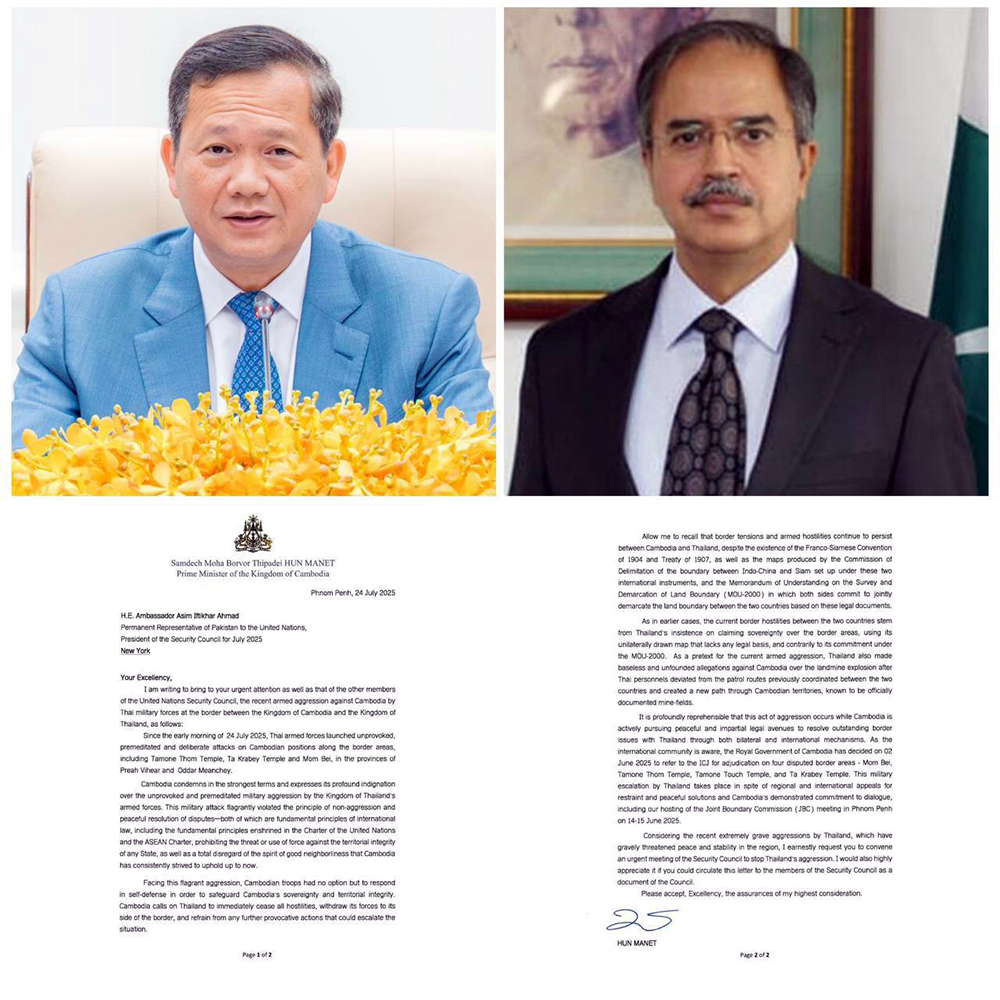 AKP Phnom Penh, July 24, 2025 -- Cambodian Prime Minister Samdech Moha Borvor Thipadei Hun Manet has sent a letter over Thailand's hostilities to H.E. Ambassador Asim Iftikhar Ahmad, Permanent Representative of Pakistan to the United Nations, President of the Securit...