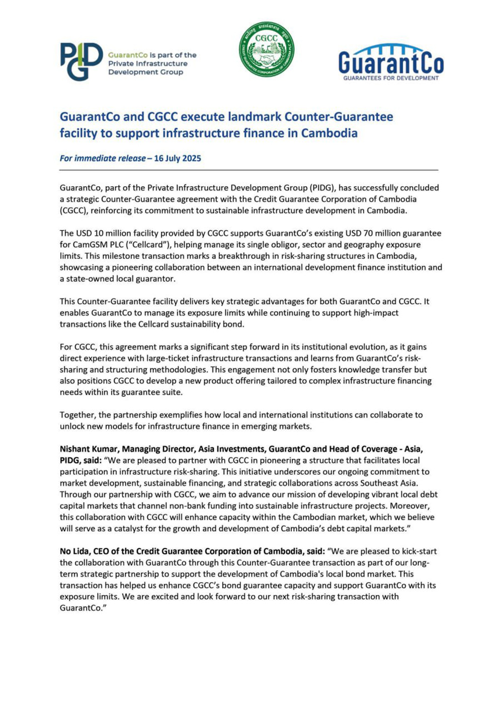 AKP Phnom Penh, July 17, 2025 -- GuarantCo, part of the Private Infrastructure Development Group (PIDG), announced on July 16 that it has successfully concluded a strategic Counter-Guarantee agreement with the Credit Guarantee Corporation of Cambodia (CGCC), reinforc...