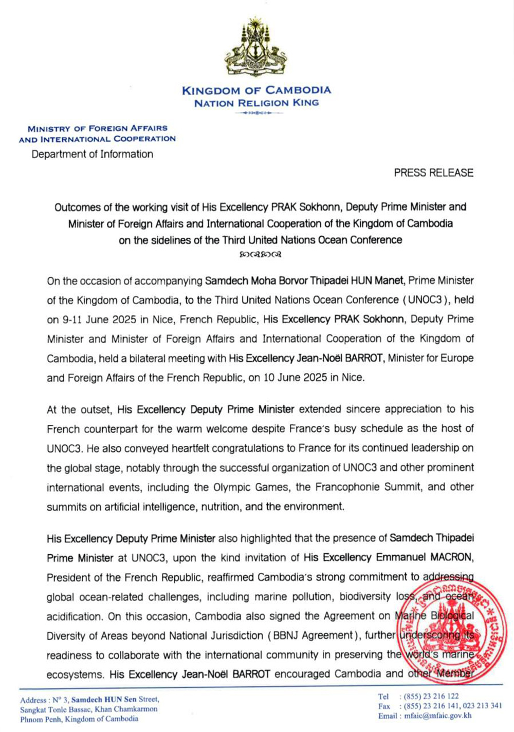 AKP Phnom Penh, June 23, 2025 -- The following are the outcomes of the working visit of H.E. PRAK Sokhonn, Deputy Prime Minister and Minister of Foreign Affairs and International Cooperation of the Kingdom of Cambodia on the sidelines of the Third United Nations Ocea...