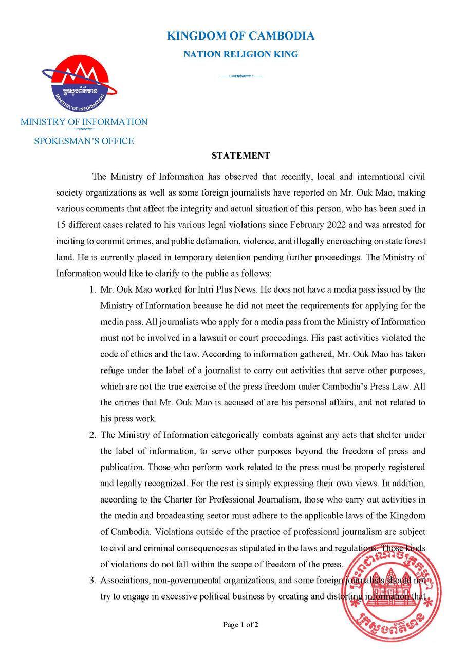 AKP Phnom Penh, May 23, 2025 -- The Ministry of Information last night issued a statement clarifying the case of Mr. Ouk Mao, a so-called journalist, and called on associations, civil society organisations and some foreign journalists to stop the political exploitati...