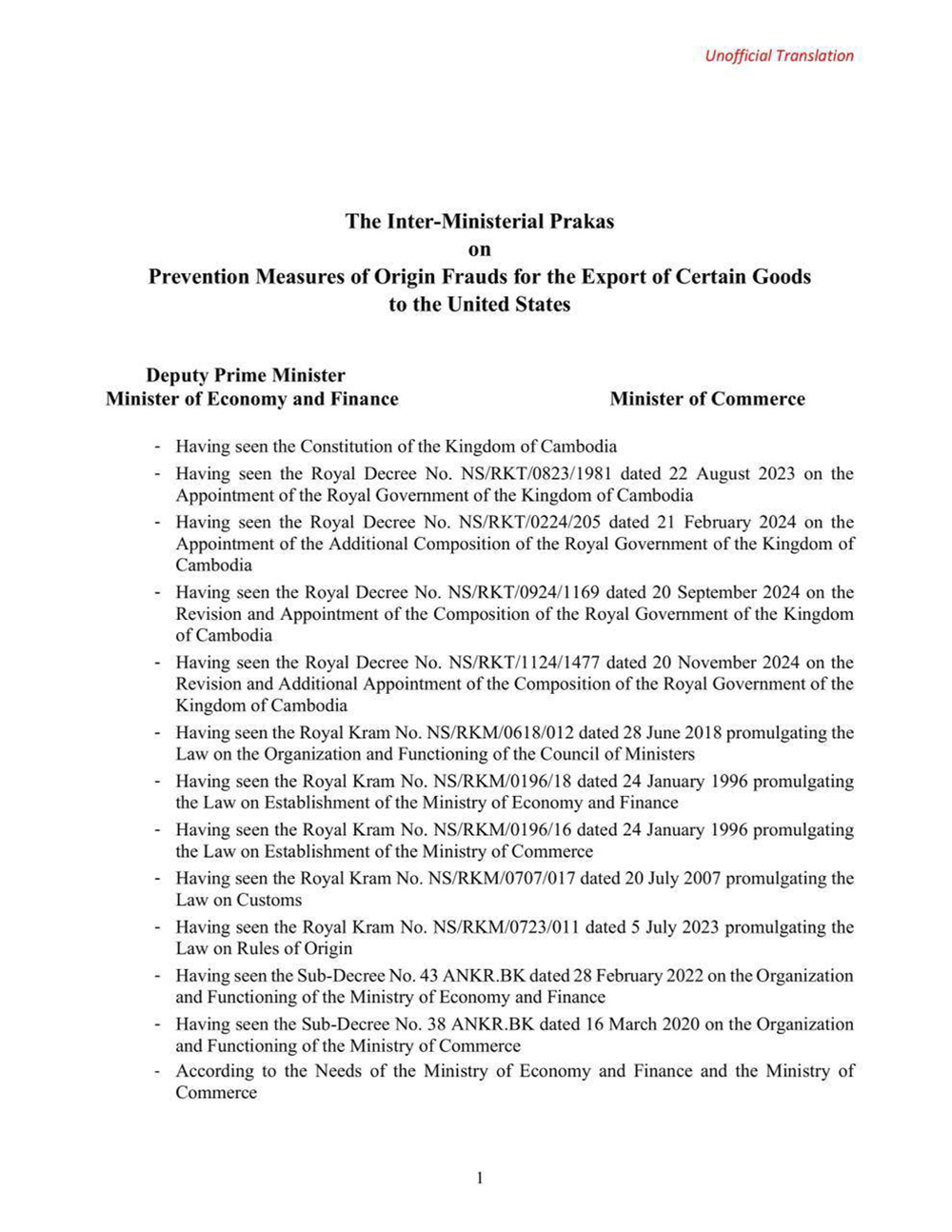 AKP Phnom Penh, May 01, 2025 -- The Ministry of Commerce has announced to issue two Prakas (Ministerial Regulations) to strengthen the exports of Cambodian products to the U.S. markets. According to the ministry’s announcement, the two Prakas are the Inter-Ministe...