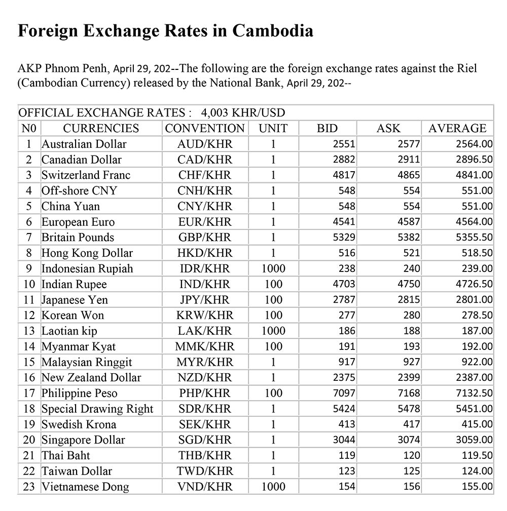 AKP Phnom Penh, April 29, 202--The following are the foreign exchange rates against the Riel (Cambodian Currency) released by the National Bank, April 29, 202--