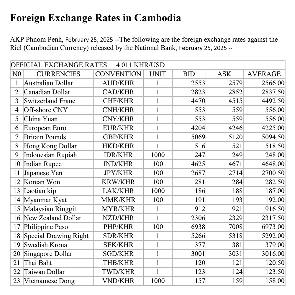 AKP Phnom Penh, February 25, 2025 --The following are the foreign exchange rates against the Riel (Cambodian Currency) released by the National Bank, February 25, 2025 --