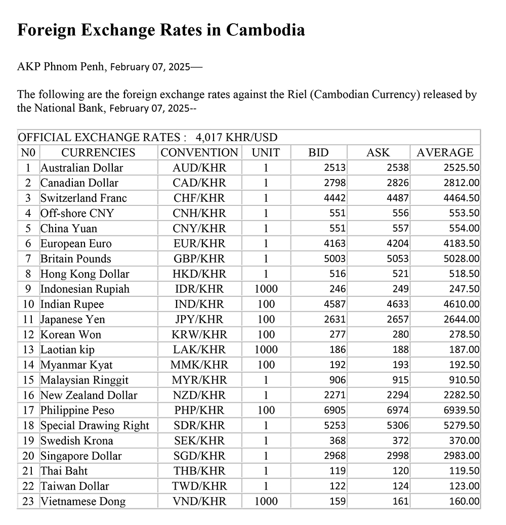 AKP Phnom Penh, February 07, 2025 -- The following are the foreign exchange rates against the Riel (Cambodian Currency) released by the National Bank, February 07, 2025.