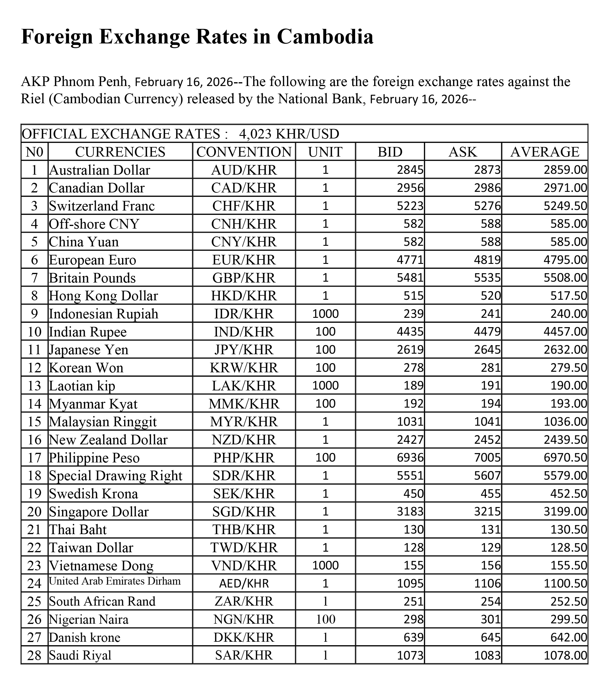 AKP Phnom Penh, February 16, 2026--The following are the foreign exchange rates against the Riel (Cambodian Currency) released by the National Bank, February 16, 2026--