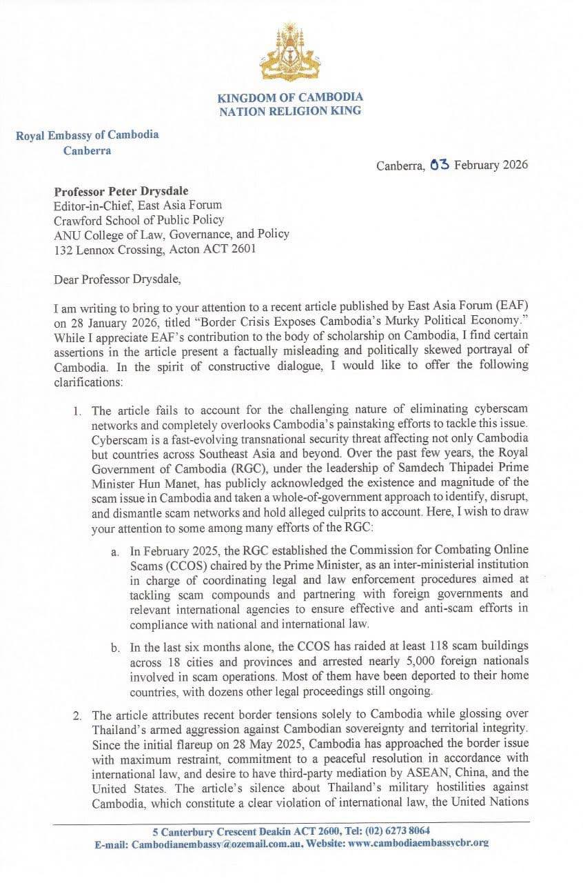 AKP Phnom Penh, February 03, 2026 -- H.E. Dr. CHEUNBORAN Chanborey, Cambodian Ambassador to Australia and New Zealand, has sent a letter to the Editor-in-Chief of East Asia Forum (EAF), rebutting the article published by EAF on Jan. 28, 2026, titled “Border Crisis Ex...
