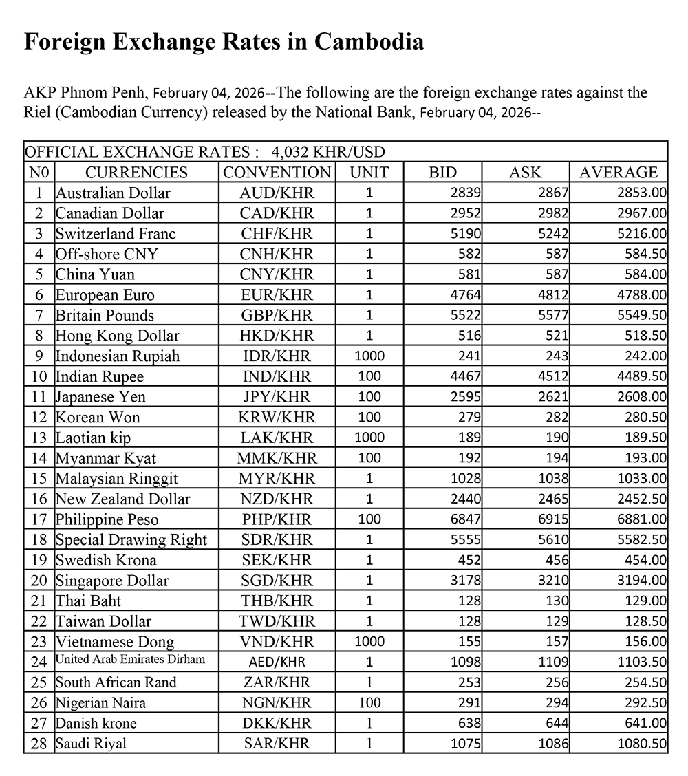 AKP Phnom Penh, February 04, 2026--The following are the foreign exchange rates against the Riel (Cambodian Currency) released by the National Bank, February 04, 2026--