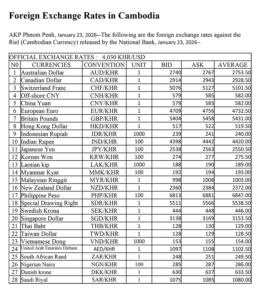 AKP Phnom Penh, January 23, 2026--The following are the foreign exchange rates against the Riel (Cambodian Currency) released by the National Bank, January 23, 2026--