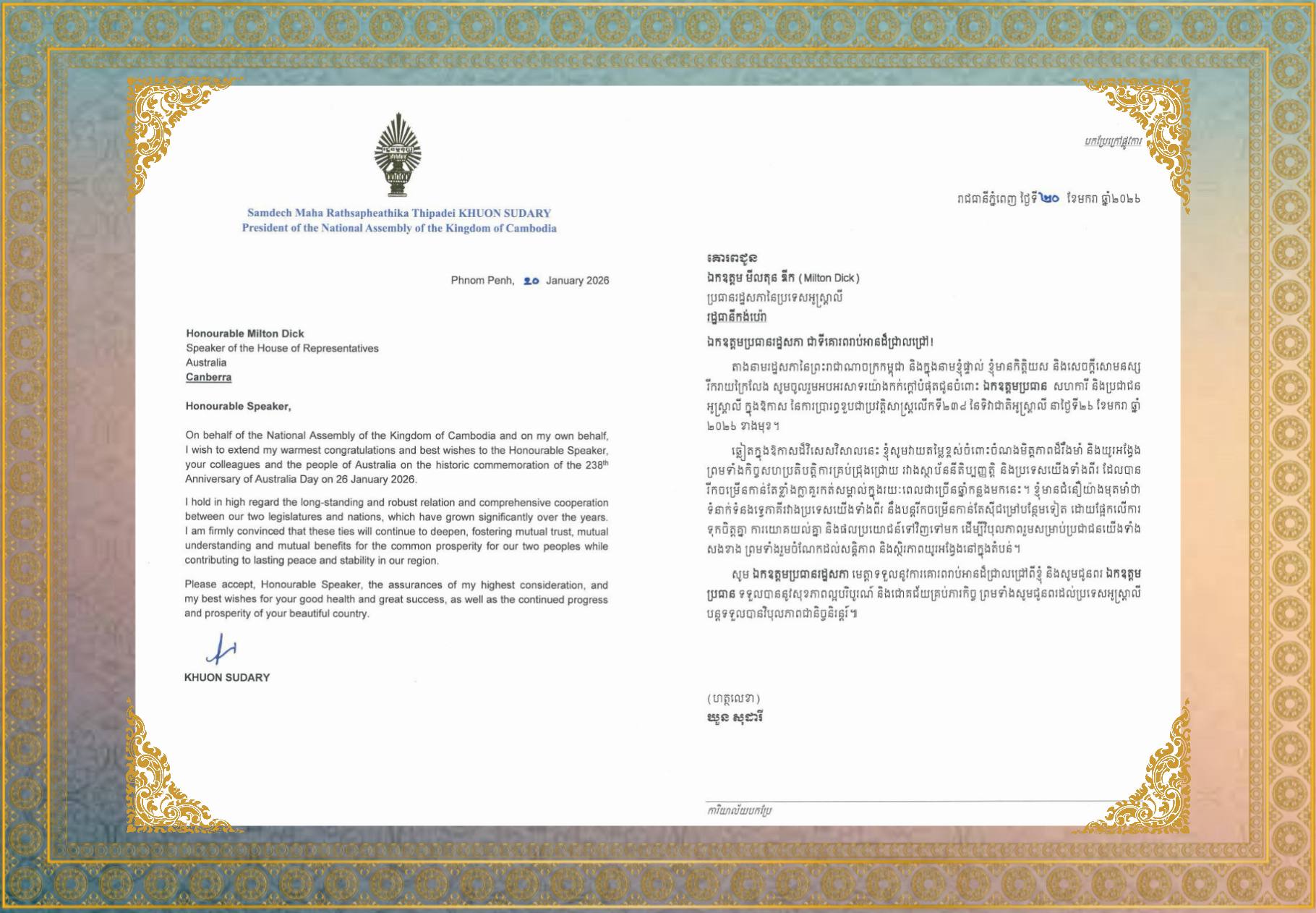 AKP Phnom Penh, January 21, 2026 -- Samdech Maha Rathsapheathika Thipadei Khuon Sudary, President of the National Assembly of Cambodia, has sent a congratulatory message to Honourable Milton Dick, Speaker of the Australian House of Representatives on the Australia Da...