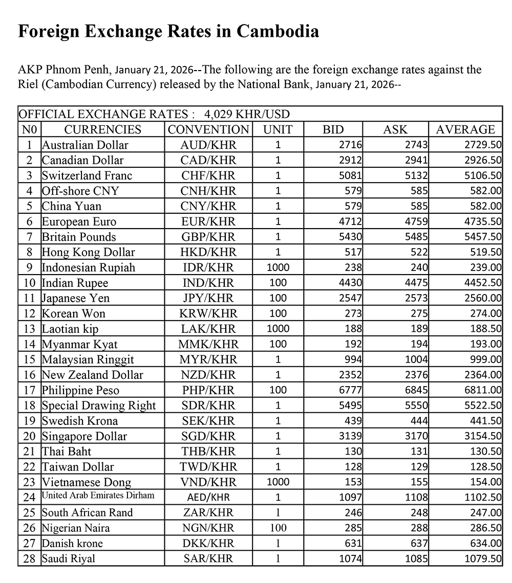 AKP Phnom Penh, January 21, 2026--The following are the foreign exchange rates against the Riel (Cambodian Currency) released by the National Bank, January 21, 2026--