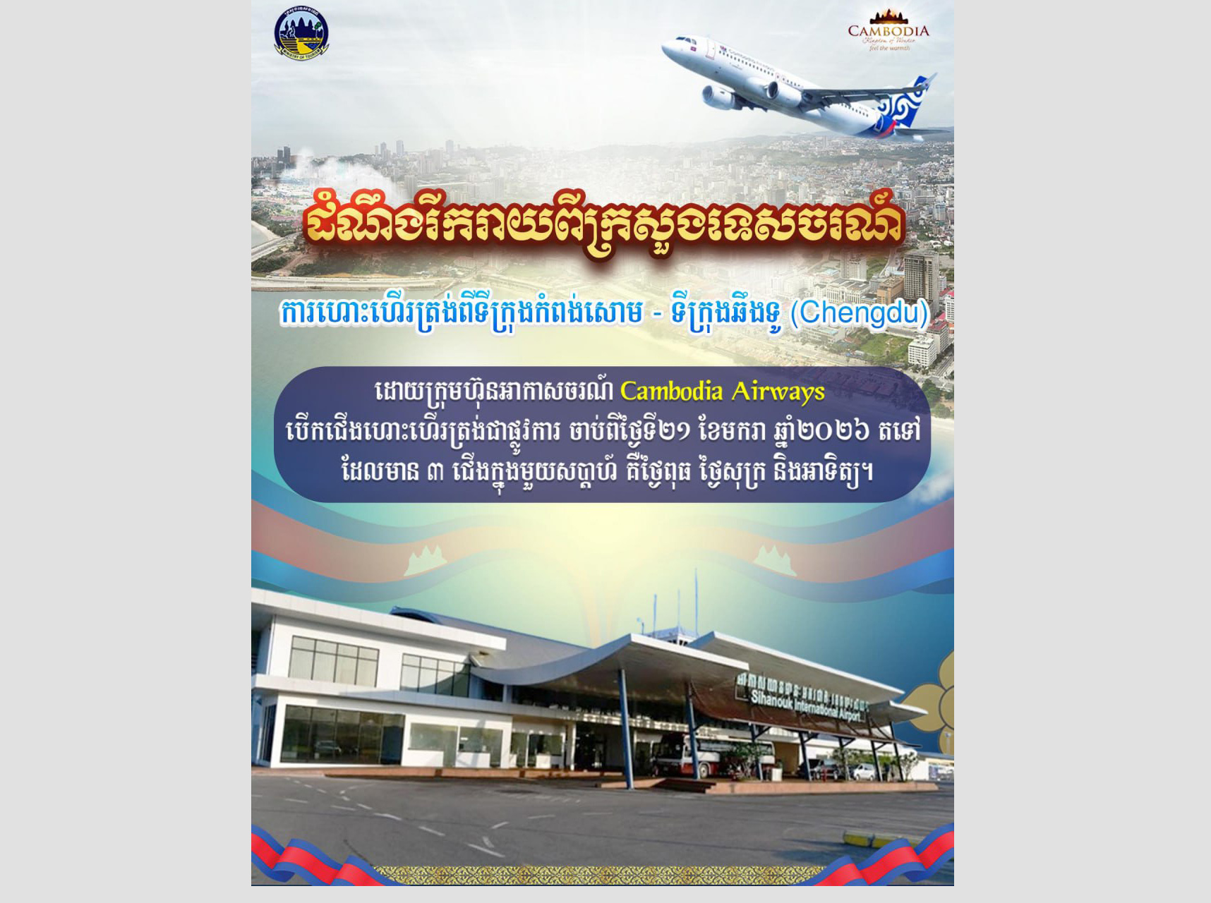 AKP Phnom Penh, January 21, 2026 -- A direct flight connecting Kampong Som city in Cambodia’s Preah Sihanouk province with Chengdu, the capital of China’s Sichuan province, operated by Cambodia Airways, was officially launched today, the Ministry of Tourism announced...