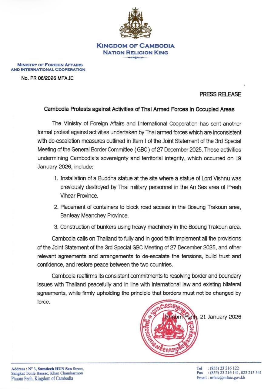 AKP Phnom Penh, January 21, 2026 -- The Royal Government of Cambodia registers its strong protest against the continued activities undertaken by the Thai Armed Forces, which raise serious concerns regarding Cambodia’s sovereignty and territorial integrity, said the G...