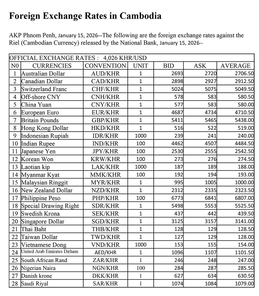 AKP Phnom Penh, January 15, 2026--The following are the foreign exchange rates against the Riel (Cambodian Currency) released by the National Bank, January 15, 2026--