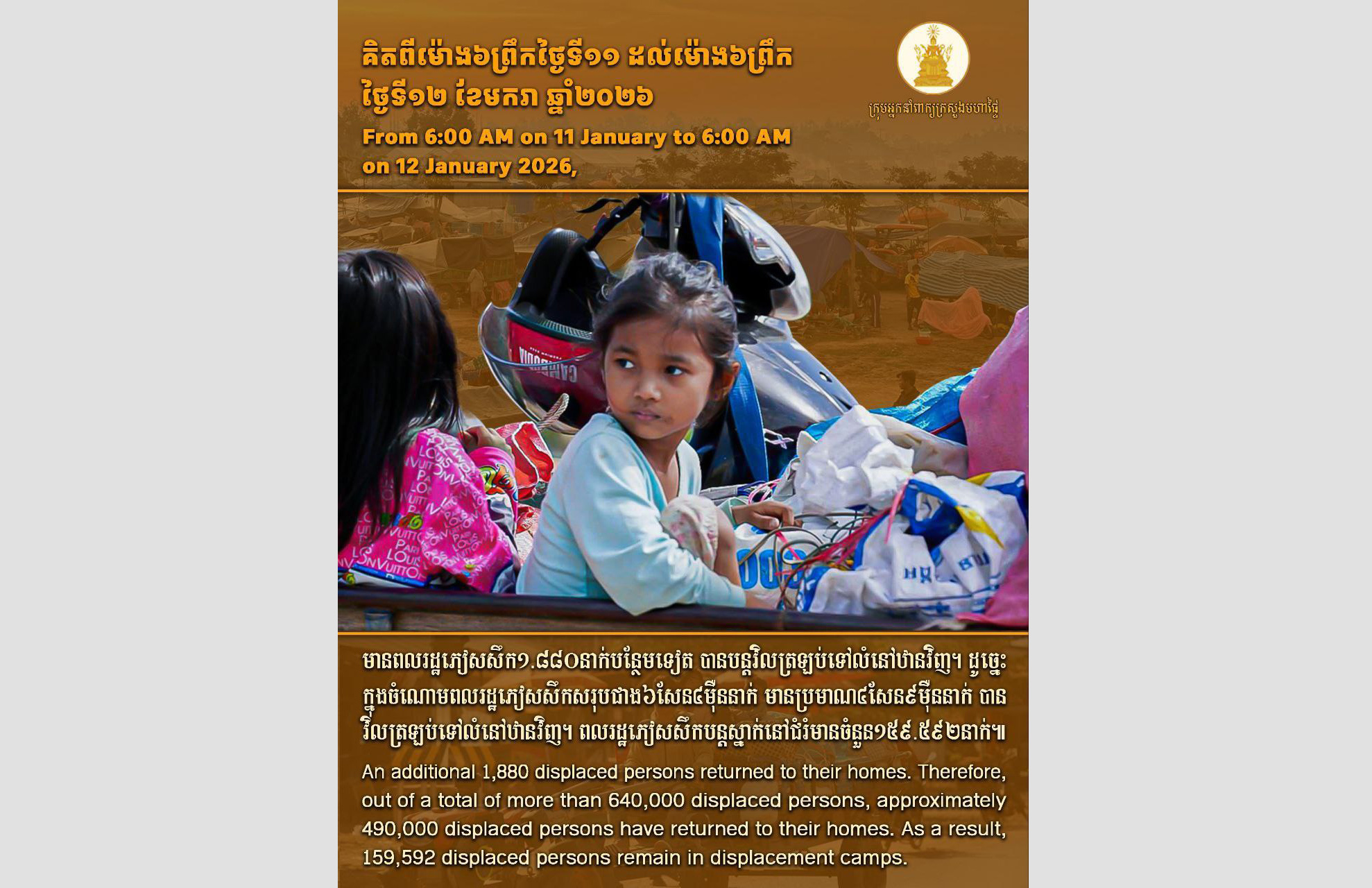 AKP Phnom Penh, January 12, 2026 -- As of this morning, approximately 490,000 of the more than 640,000 displaced persons have returned to their local communities, following the return of an additional 1,880 people, according to the Ministry of Interior. As a resul...
