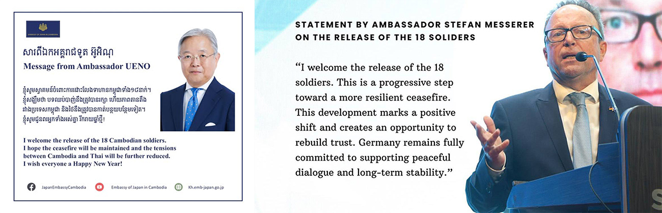 AKP Phnom Penh, December 31, 2025 -- The Embassies of Japan and Germany in Cambodia this afternoon issued separate statements welcoming the release of the 18 detained Cambodian soldiers by the Thai side. “I hope the ceasefire will be maintained and the tensi...