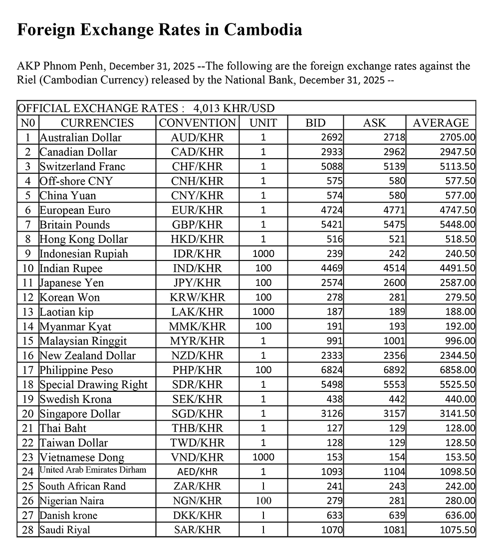 AKP Phnom Penh, December 31, 2025 --The following are the foreign exchange rates against the Riel (Cambodian Currency) released by the National Bank, December 31, 2025 --