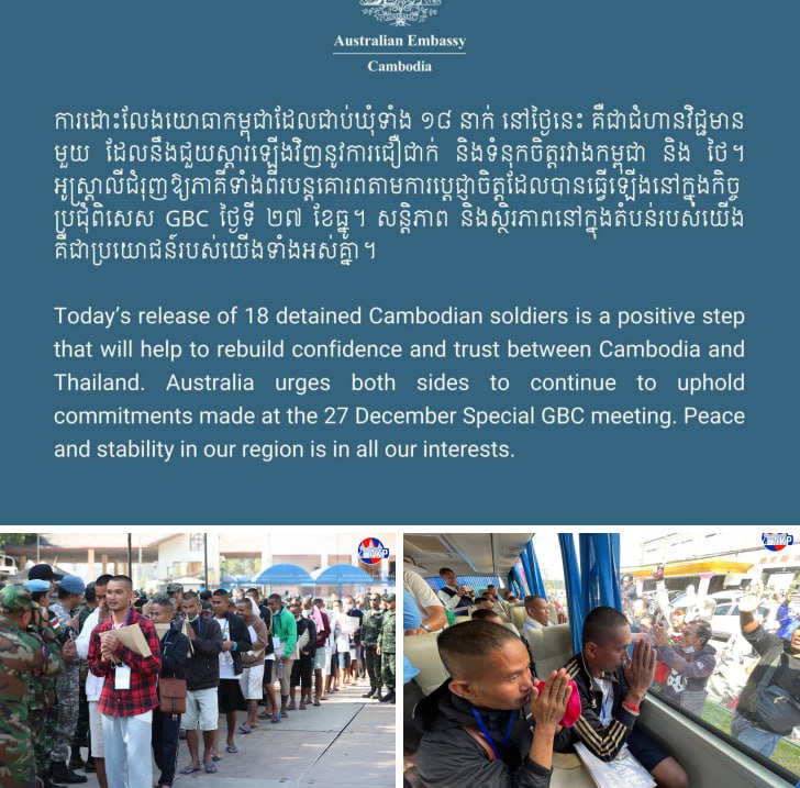 AKP Phnom Penh, December 31, 2025 -- The Australian Embassy in Cambodia welcomed the released of the 18 detained Cambodian soldiers, stressing that today’s release is a positive step that will help to rebuild confidence and trust between Cambodia and Thailand. ...