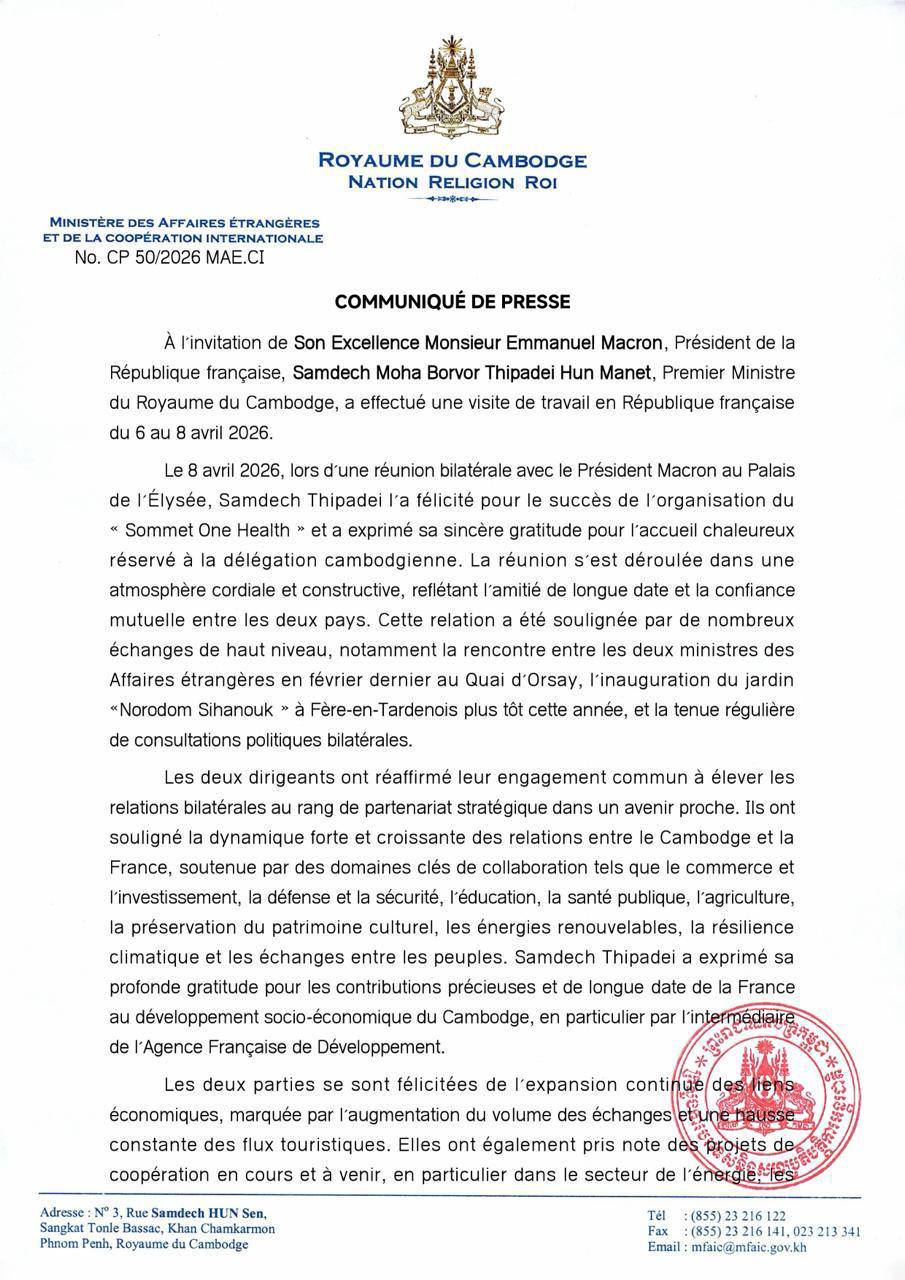 AKP Phnom Penh, le 09 avril 2026 -- Le Premier ministre du Royaume du Cambodge, Samdech Moha Borvor Thipadei Hun Manet, a réaffirmé la position du Cambodge sur la question frontalière avec la Thaïlande lors d’une rencontre bilatérale avec le président français, Emmanuel Macron, à Paris le 8 avril. S’exprima...