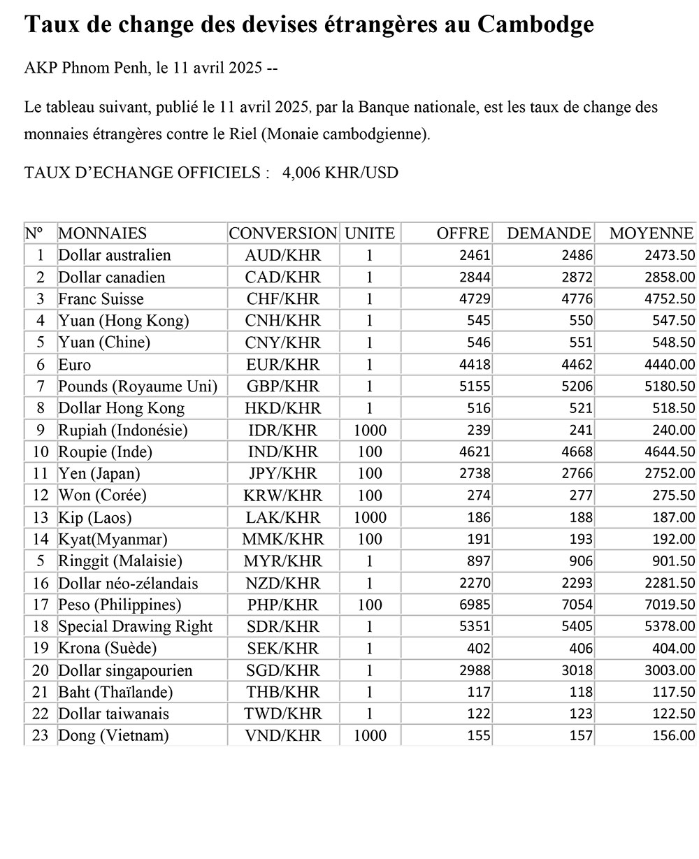 AKP Phnom Penh, le 11 avril 2025 -- Le tableau suivant, publié le 11 avril 2025, par la Banque nationale, est les taux de change des monnaies étrangères contre le Riel (Monaie cambodgienne).