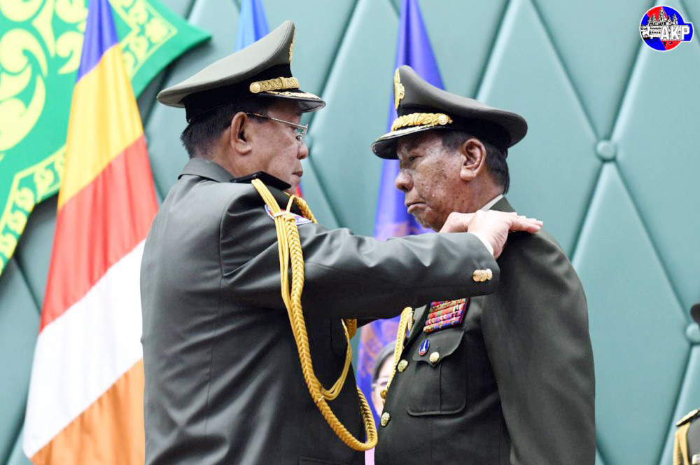 AKP Phnom Penh, le 21 mars 2025 -- Deux anciens hauts officiels du gouvernement royal du Cambodge se sont vu décerner officiellement le grade de général cinq étoiles dans une cérémonie tenue ce matin au Palais de la Paix, à Phnom Penh, sous la présidence de Samdech Akka Moha Sena Padei Techo Hun Sèn, chef d'Etat p.i...
