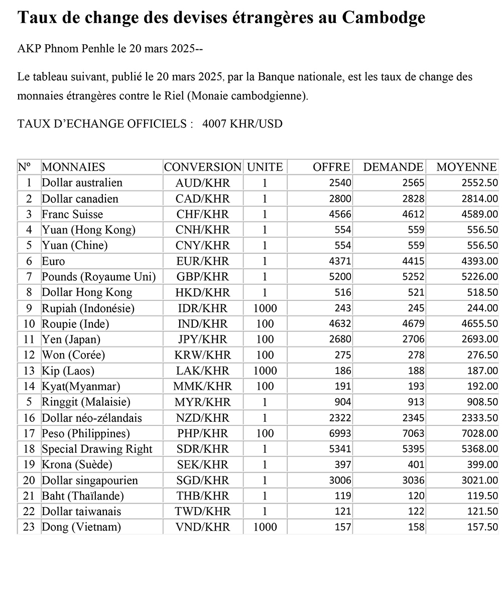 AKP Phnom Penh, le 20 mars 2025 -- Le tableau suivant, publié le 20 mars 2025, par la Banque nationale, est les taux de change des monnaies étrangères contre le Riel (Monaie cambodgienne).