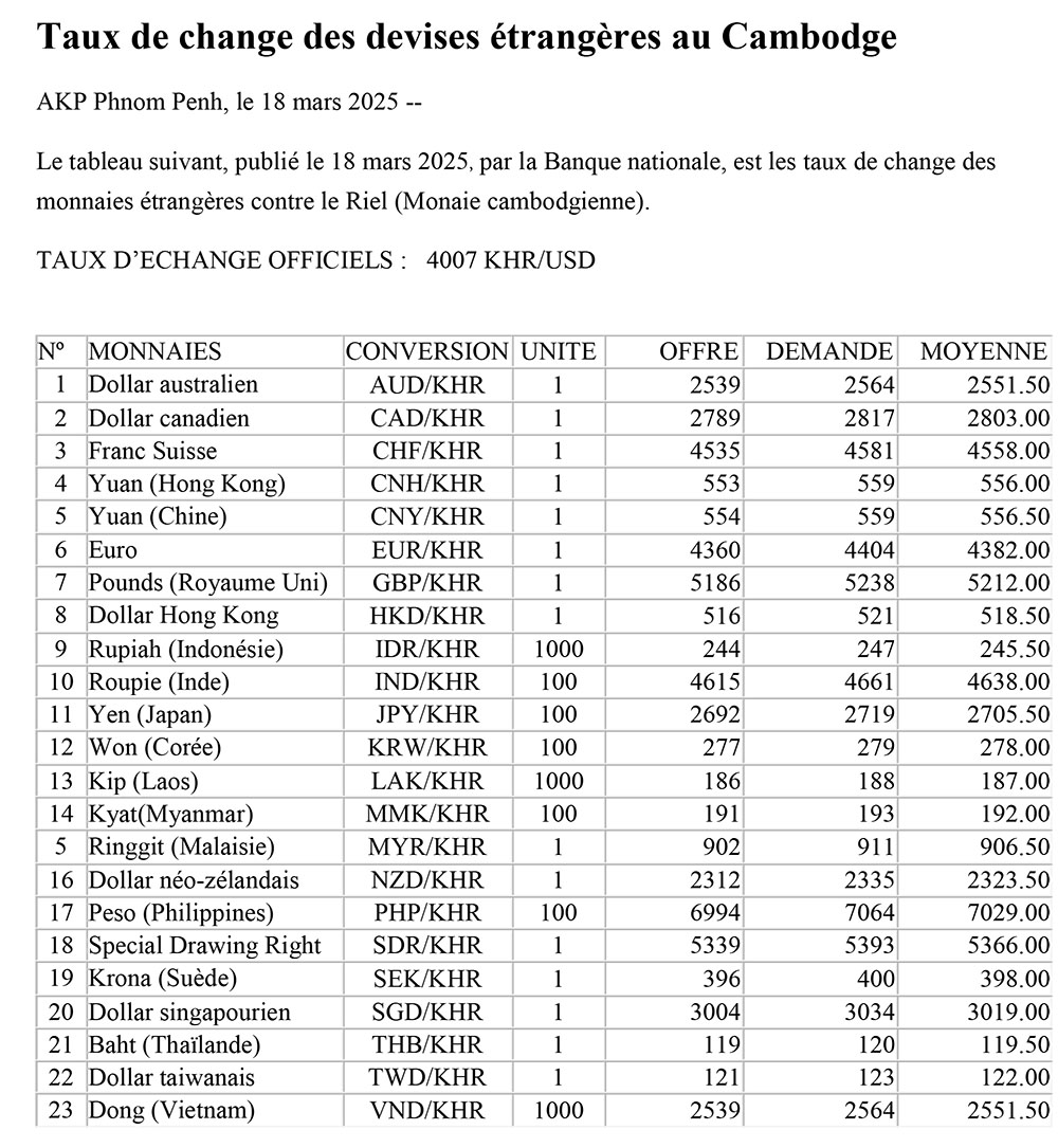 AKP Phnom Penh, le 18 mars 2025 -- Le tableau suivant, publié le 18 mars 2025, par la Banque nationale, est les taux de change des monnaies étrangères contre le Riel (Monaie cambodgienne).