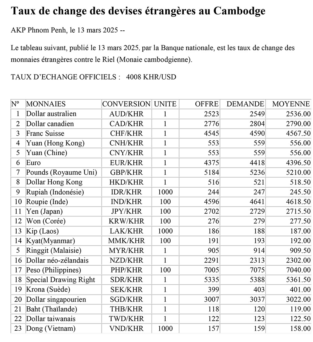 AKP Phnom Penh, le 13 mars 2025 -- Le tableau suivant, publié le 13 mars 2025, par la Banque nationale, est les taux de change des monnaies étrangères contre le Riel (Monaie cambodgienne).
