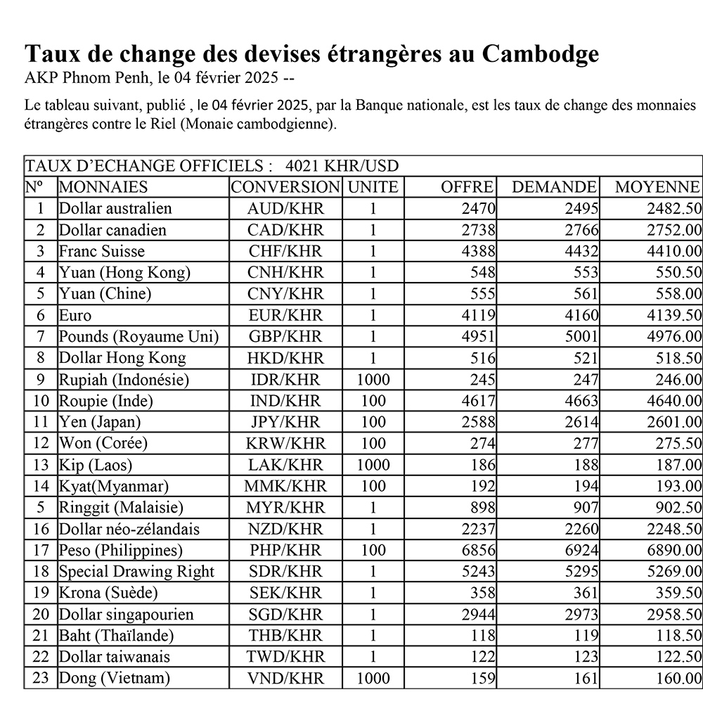 AKP Phnom Penh, le 04 février 2025 -- Le tableau suivant, publié , le 04 février 2025, par la Banque nationale, est les taux de change des monnaies étrangères contre le Riel (Monaie cambodgienne).