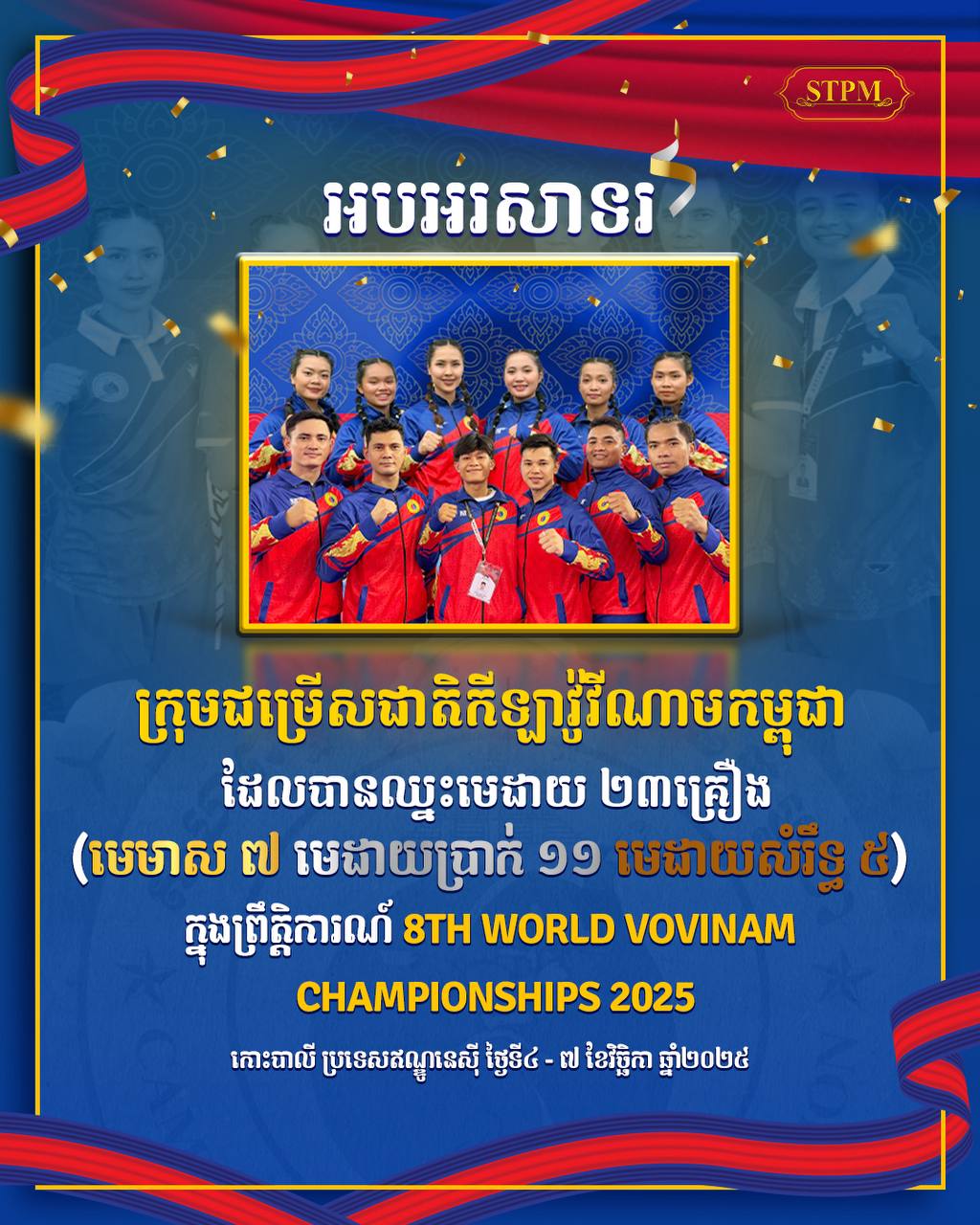 AKP Phnom Penh, le 07 novembre 2025 -- L'équipe cambodgienne de Vovinam a décroché un total de 23 médailles sur 26 épreuves lors du 8e Championnat du monde de Vovinam, qui se déroule à Bali, en Indonésie, du 2 au 8 novembre 2025. Parmi ces médailles, on compte 7 d'or, 11 d'argent et 5 de bronze, ce qui constitue...