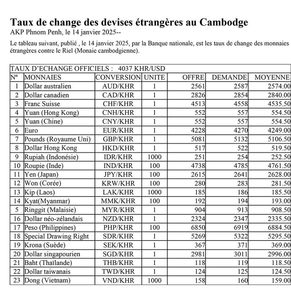 Le tableau suivant, publié , le 14 janvier 2025, par la Banque nationale, est les taux de change des monnaies étrangères contre le Riel (Monaie cambodgienne).