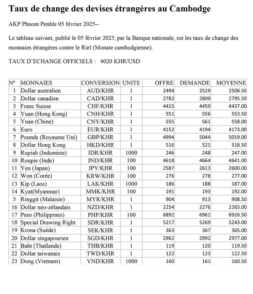 Le tableau suivant, publié , le 05 février 2025, par la Banque nationale, est les taux de change des monnaies étrangères contre le Riel (Monaie cambodgienne).