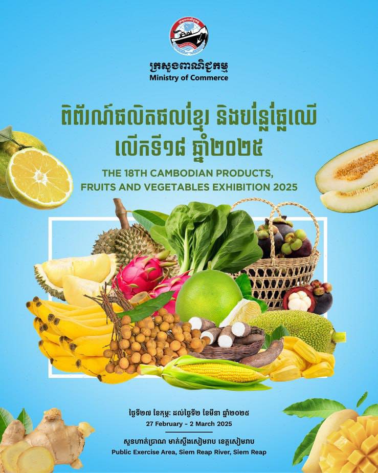 Le ministère du Commerce organisera du 27 février au 2 mars prochain la « 18e Exposition de produits cambodgiens et de fruits et légumes 2025 » dans la zone d'exercice public le long de la rivière de Siem Reap dans la province de Siem Reap.