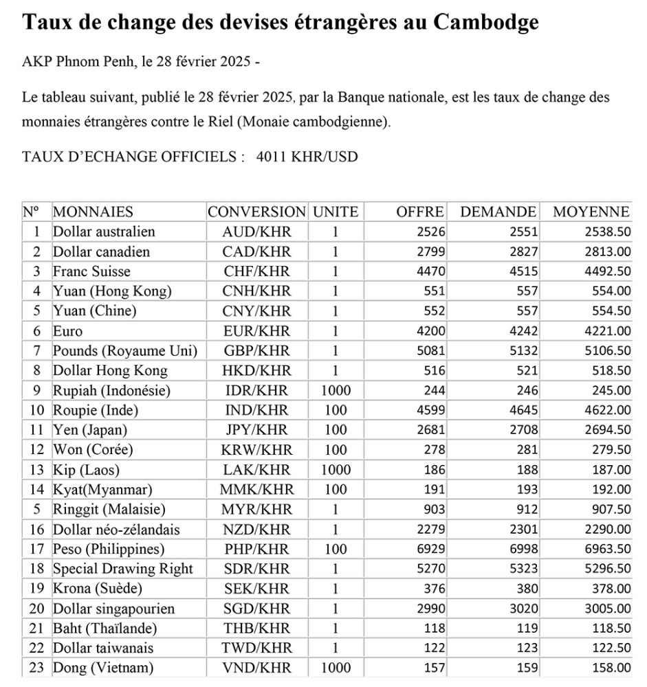 Le tableau suivant, publié le 28 février 2025, par la Banque nationale, est les taux de change des monnaies étrangères contre le Riel (Monaie cambodgienne).