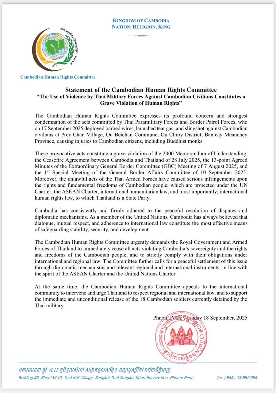 Dans la déclaration, le CHRC a exprimé sa profonde préoccupation et condamné avec la plus grande fermeté les actes commis par les forces paramilitaires et les gardes-frontières thaïlandais. Le 17 septembre 2025, ces derniers ont déployé des barbelés, lancé des gaz lacrymogènes et utilisé des lance-pierres contre des civils cambodgiens au village de Prey Chan, commune d'O' Beichoan, district d'O' Chrov, province de Banteay Meanchey, blessant des citoyens cambodgiens, dont des bonzes.