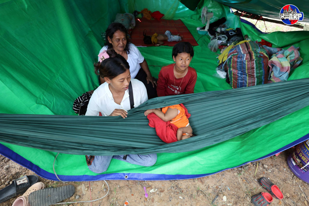 Vue générale du centre de sécurité Chan Sy Samaki Ratanaram, situé dans la commune de Kop, district d’O’Chrov, province de Banteay Meanchey, alors que le nombre des déplacés a dépassé les 400 familles ce matin, suite aux attaques brutales perpétrées par les forces armées thaïlandaises contre des civils cambodgiens dans le village de Prey Chan, commune d’O’ Beichoan, district d’O’ Chrov, province de Banteay Meanchey.