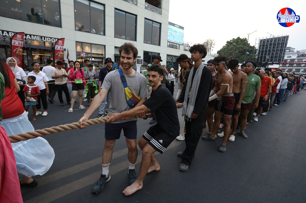Hun Many (1er à gauche, photo 1), vice-Premier ministre, ministre de la Fonction publique et président de l'Union des fédérations de jeunes du Cambodge (UYFC), participe ce soir au tir à la corde de l'amitié de Nokor Sankranta, tenu sur la rue piétonne Chaktomuk. Cette compétition de 250 m a été organisée pour célébrer le Nouvel An khmer traditionnel, l'Année du Cheval.