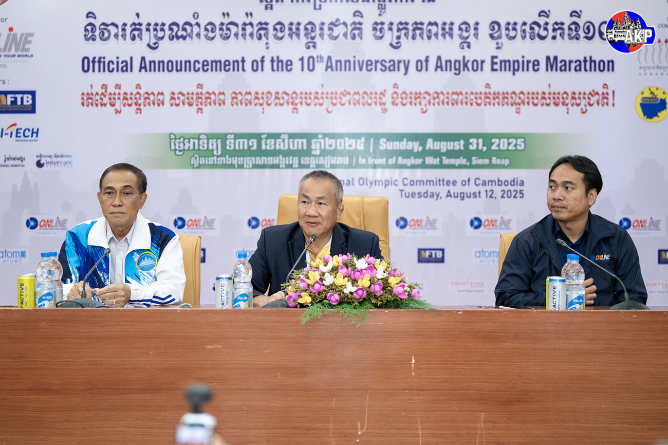 AKP Phnom Penh, August 12, 2025 -- H.E. Vath Chamroeun (C, Pic. 1), Secretary-General of the National Olympic Committee of Cambodia (NOCC), holds a press conference in Phnom Penh this morning to officially announce the 10th Angkor Empire Marathon, scheduled to take place o...