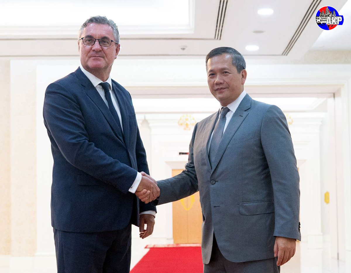 AKP Phnom Penh, July 07, 2025— Prime Minister of the Kingdom of Cambodia, Samdech Moha Borvor Thipadei Hun Manet (R, Pic. 1), poses for a photo with H.E. Jacques Pellet, outgoing Ambassador of the French Republic to the Kingdom of Cambodia, prior to a farewell courtesy call at...