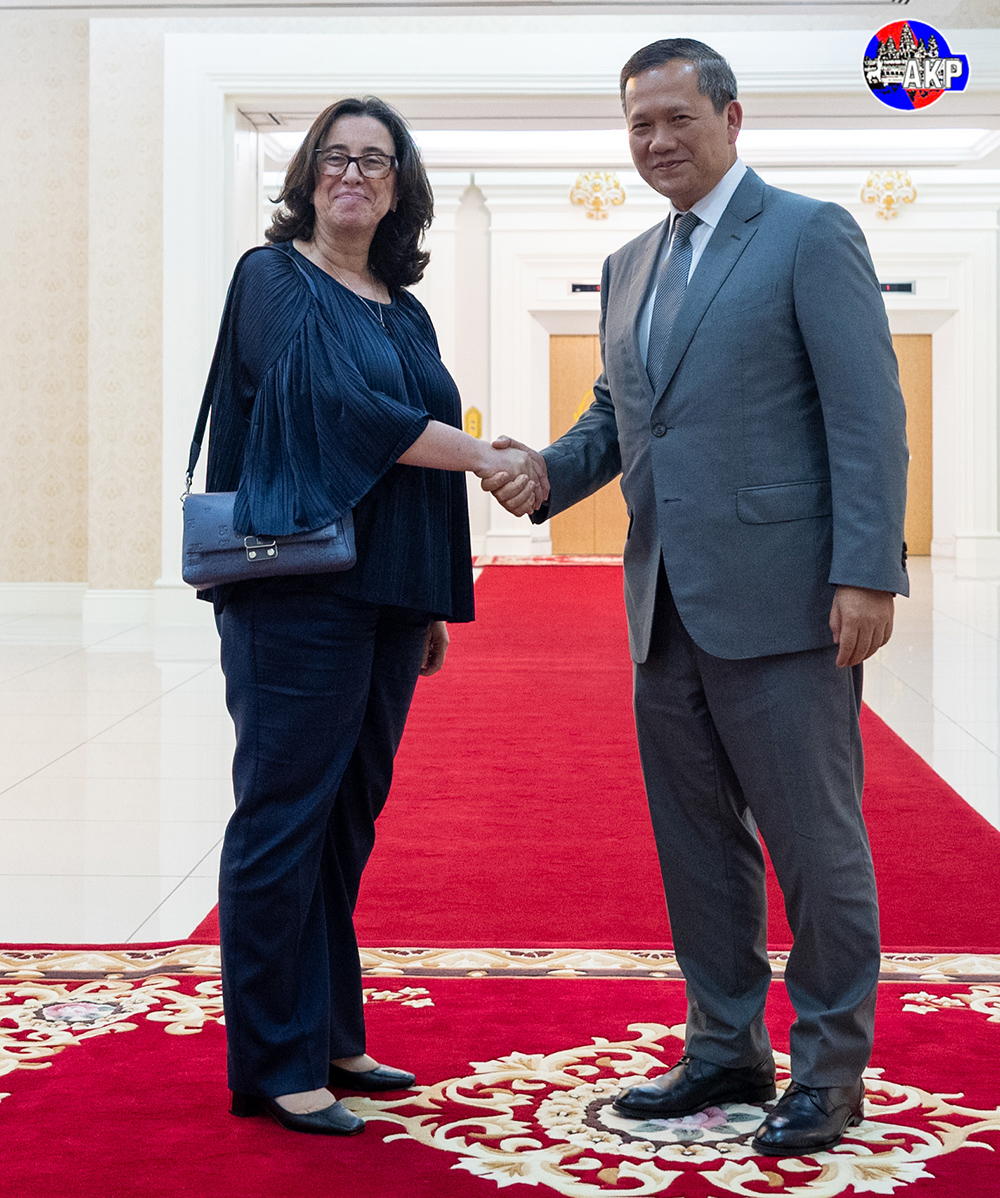 AKP Phnom Penh, July 07, 2025— Cambodian Prime Minister Samdech Moha Borvor Thipadei Hun Manet (R, Pic. 1) poses for a photo with H.E. Ms. Manuela V. Ferro, World Bank Regional Vice President for East Asia and Pacific, prior to their courtesy meeting at the Peace Palac...