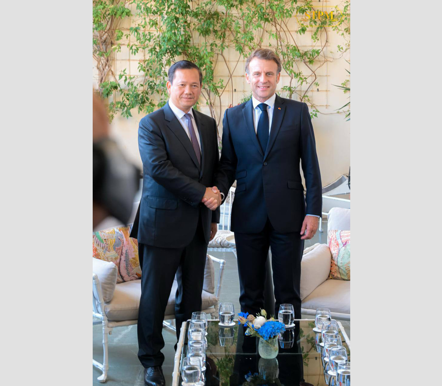 AKP Nice, June 11, 2025— Cambodia’s Prime Minister Samdech Moha Borvor Thipadei Hun Manet (L, Pic. 1) poses for a photo with President of the French Republic, H.E. Emmanuel MACRON, on the evening of June 10 in Nice, France (local time), on the sidelines of the Third UN Oce...