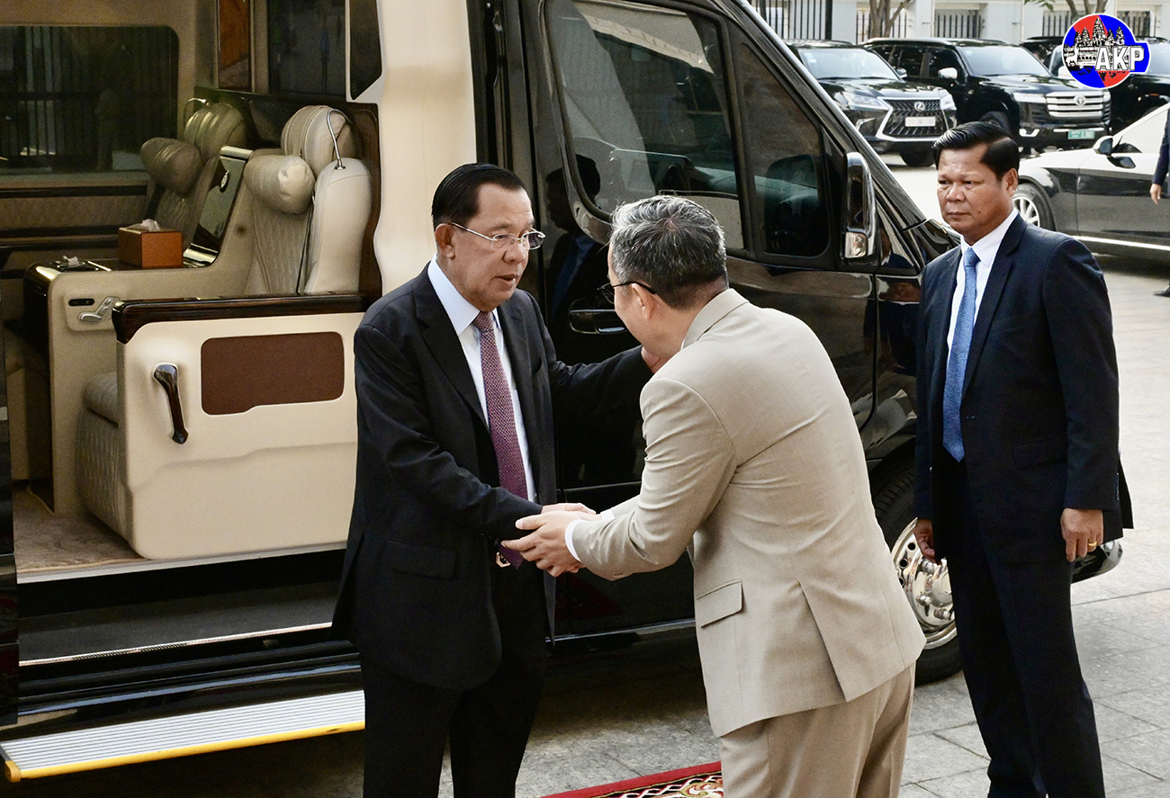 AKP Phnom Penh, April 30, 2025— Prime Minister Samdech Moha Borvor Thipadei Hun Manet (R, Pic. 1) shakes hands with Mr. Simon Chen, Chairman and CEO of ADATA Technology Co., Ltd., prior to their courtesy meeting at the Peace Palace in Phnom Penh this morning. Photo: Kul...