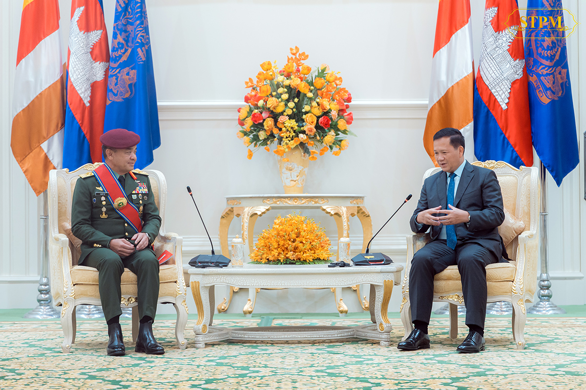 AKP Phnom Penh, April 22, 2025– Samdech Moha Borvor Thipadei Hun Manet (R, Pic. 1), Prime Minister of the Kingdom of Cambodia, receives visiting H.E. Gen. Tan Sri Dato’ Wira Muhammad Hafizuddeain Bin Jantan, Chief of the Malaysian Army, at the Peace Palace here t...