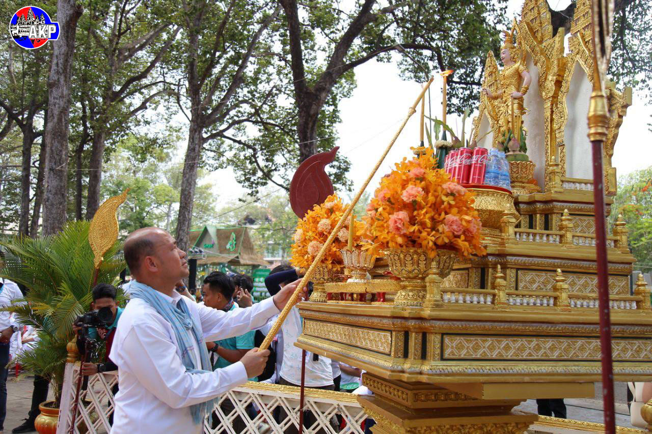 AKP Siem Reap, April 16, 2025– H.E. Hun Many (Pic. 1), President of the Union of Youth Federations of Cambodia (UYFC), presides over a procession ceremony of Buddha statues from Reach Bo Pagoda to the garden in front of the Royal Residence for the tradition...