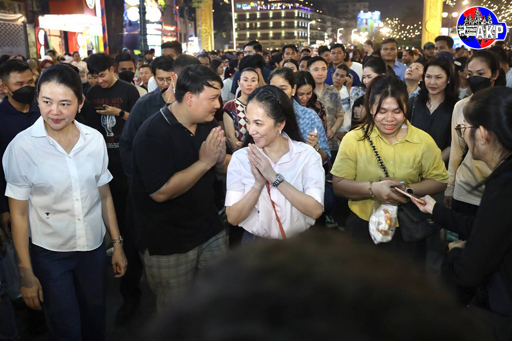 AKP Phnom Penh, April 05, 2025 — First Lady Lok Chumteav Dr. Pich Chanmony (C, Pic. 1) this evening visits Walk Street, which was opened, since February, every Saturday and Sunday from 18:00 to 23:00 along Preah Sisowath Quay, from Baksey Chamkrong Street (Street 9...