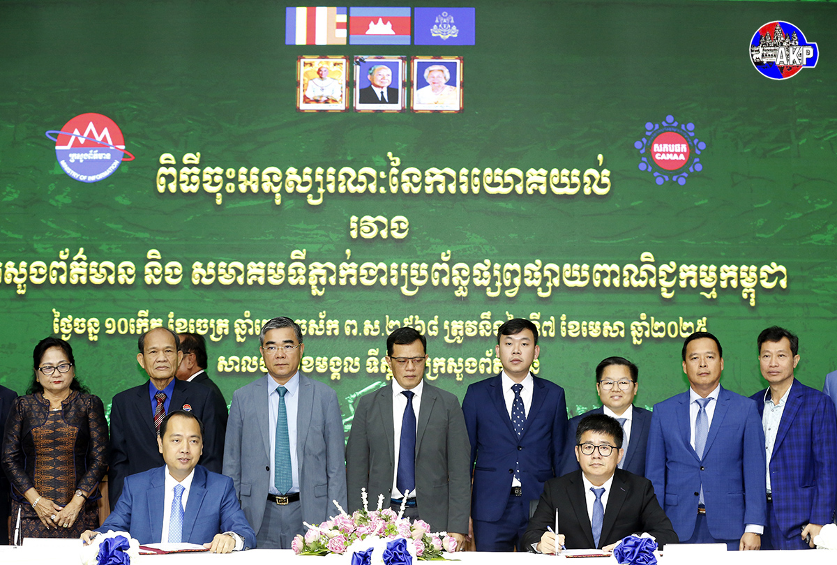 AKP Phnom Penh, April 07, 2025— Net Pheaktra (L, Sitting, Pic. 1), Minister of Information, and Mr. Kien San, President of the Cambodia Association of Media Advertising Agencies (CAMAA), sign at the ministry this morning a cooperation Memorandum of Understanding (M...