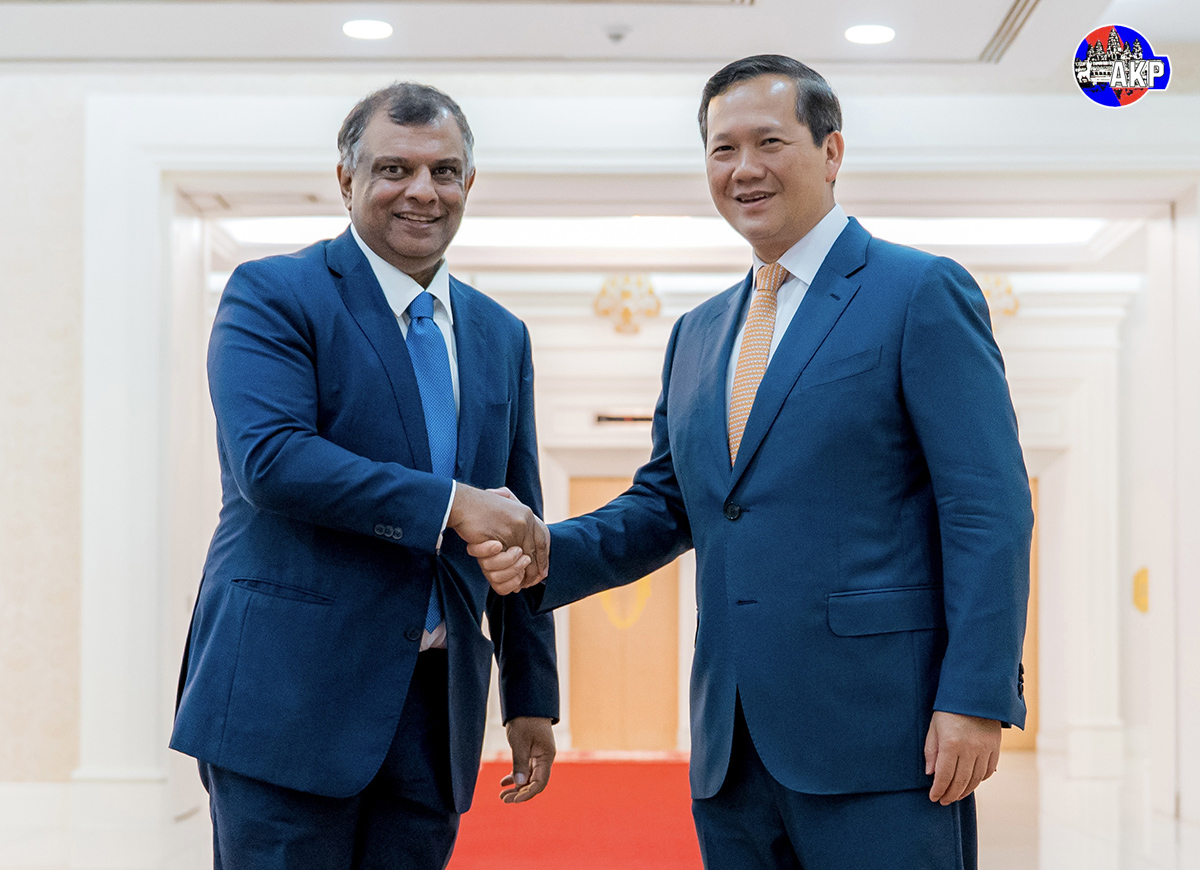 AKP Phnom Penh, March 20, 2025— Samdech Moha Borvor Thipadei Hun Manet (R, Pic. 1), Prime Minister of the Kingdom of Cambodia, greets visiting H.E. Tan Sri Tony Fernandes, Chief Executive Officer of AirAsia Group, prior to their courtesy meeting at the Peace Palace her...