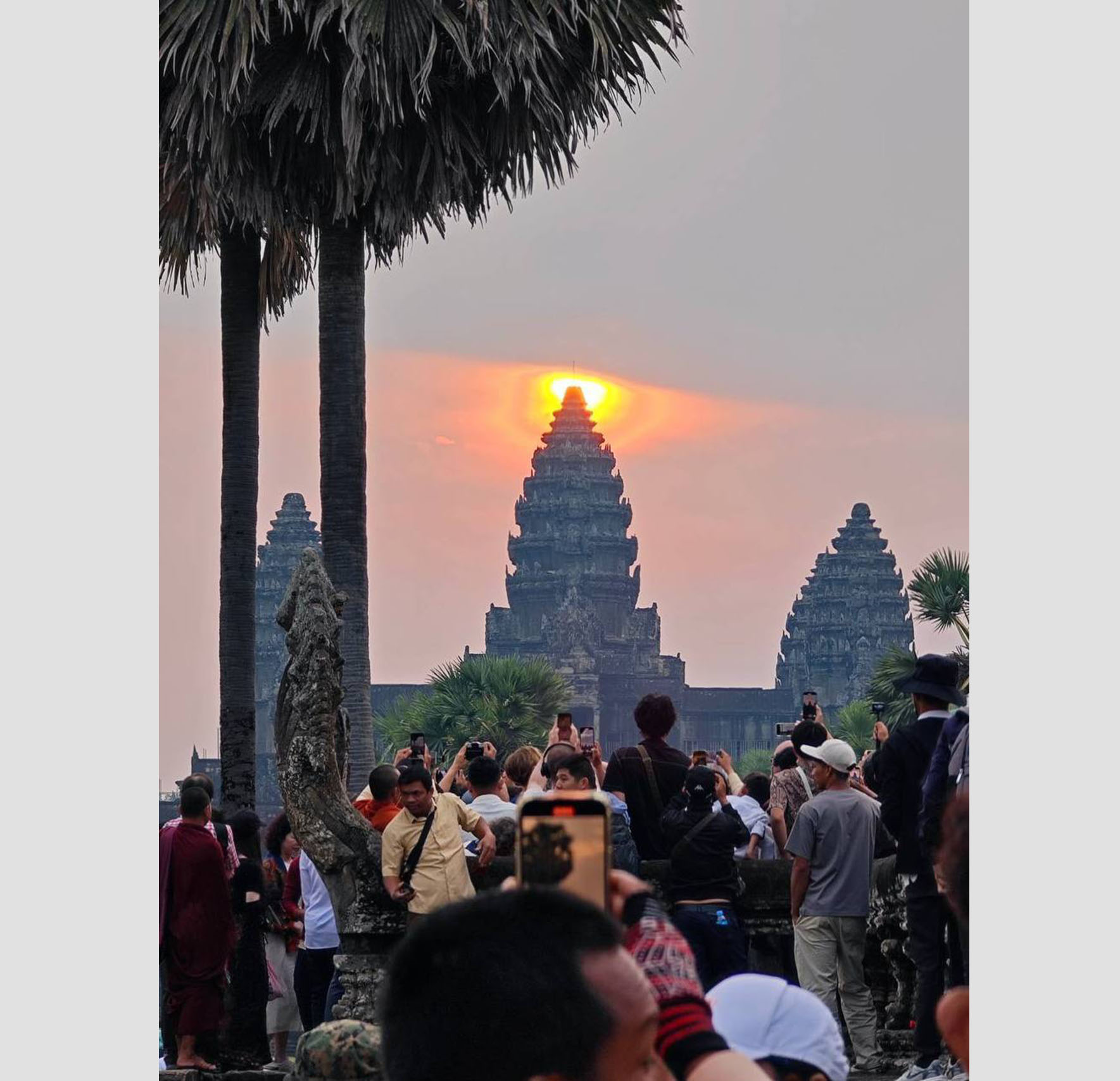 AKP Siem Reap, March 21, 2025— National and international tourists flock into Angkor Wat Temple to admire and capture photos of Angkor Equinox (sunrise over the central tower of the Angkor Wat Temple) in Siem Reap province this morning. Photo: Khuth Sao